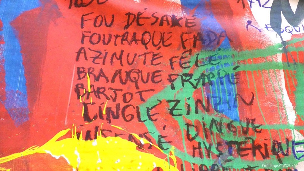 La fresque exposée pour l’occasion a été offerte au Printemps de la psychiatrie le 14 mars par la troupe du Spectacle Pro Bono Publico, qui en réalise une à chaque représentation. On y distingue à peine les dernières lettres peintes, La folie n’est pas une affaire personnelle.