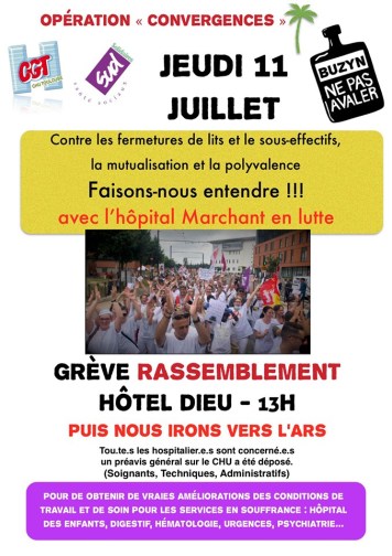 Il apporte son soutien total à la manifestation du jeudi 11 juillet qui regroupera les personnels, les patients et les familles dans une grande marche festive vers la direction des hôpitaux de Toulouse à l’Hôtel Dieu, afin de réclamer des moyens pour des soins dignes et humains. »