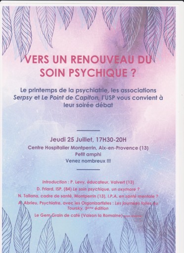 Le printemps de la psychiatrie, les associations Serpsy (Soin Etudes et Recherche en PSYchiatrie) et le Point de Capiton, l’ USP (Union syndicale de la psychiatrie), se proposent de sillonner la Région PACA en tous sens et en tous lieux où on les invitera (lieux de soins, lieux de culture, Gems, clubs thérapeutiques, etc.) pour organiser des soirées/débat, susciter des rencontres entre usagers et professionnels, entre familles et théâtreux, entre travailleurs du social et artistes, entre citoyens tous concernés, de près ou de loin, par les troubles psychiques et la façon dont ils sont accueillis, soignés, accompagnés, dépassés, intégrés, cultivés, approchés, magnifiés, compris.