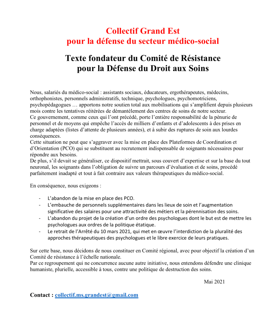 Le Collectif Grand Est a organisé le Samedi 25 septembre 2021 la Convention Nationale « pour la Défense du secteur médico-social, de la psychiatrie et de l’accès aux soins pour tous », dont voici le dossier de presse :