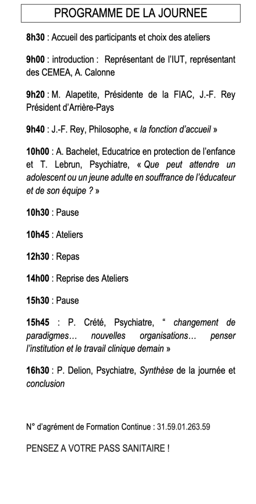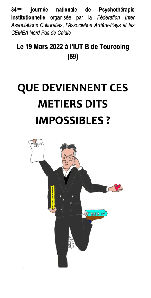 34ème Journée nationale de Psychothérapie Institutionnelle, le 19 mars 2022, à Tourcoing Il reste encore des places pour s’inscrire (à la date du 9 mars) : Partager : Cliquer pour partager sur X(ouvre dans une nouvelle fenêtre) X Cliquez pour partager sur Facebook(ouvre dans une nouvelle fenêtre) Facebook J’aime chargement… Sur le même thème