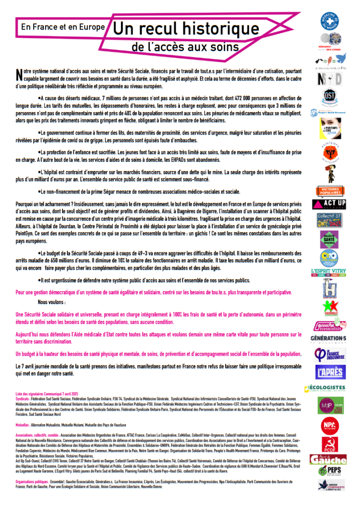 7 avril 2025 : Journée mondiale de la santé Communiqué signé par le Printemps de la psychiatrie : Appel Tdf Santé 7 avril 25Télécharger Partager : Partager sur X(ouvre dans une nouvelle fenêtre) X Partager sur Facebook(ouvre dans une nouvelle fenêtre) Facebook J’aime chargement… Sur le même thème