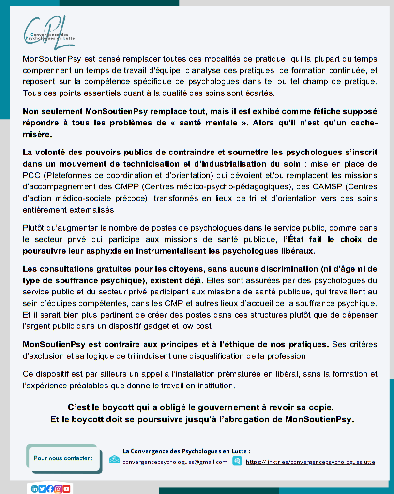 MonSoutienPsy : le boycott continue! Communiqué CPL 24 mars 2025Télécharger Partager : Cliquer pour partager sur X(ouvre dans une nouvelle fenêtre) X Cliquez pour partager sur Facebook(ouvre dans une nouvelle fenêtre) Facebook J’aime chargement… Sur le même thème