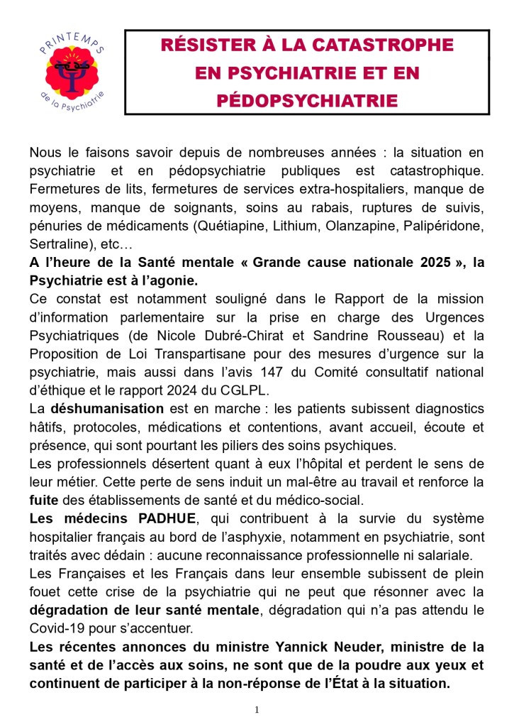 Intitulé La psychiatrie d’aujourd’hui et de demain : répondre à l’urgence, répondre aux besoins et porté par Elise Leboucher de LFI, ce colloque faisait suite à plusieurs rencontres entre le Printemps de la psychiatrie et les parlementaires du Nouveau Front Populaire depuis le mois de septembre 2024.