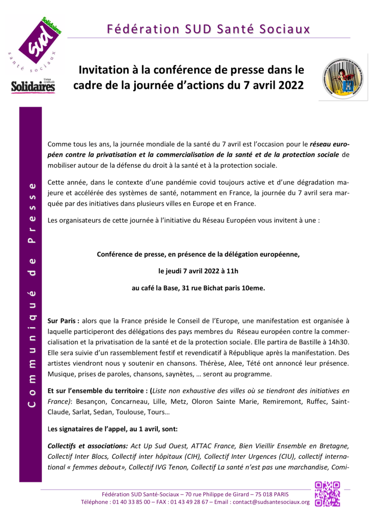 JEUDI 7 : appel signé par le Printemps pour la Journée Mondiale de la Santé. Paris, 14 h 30 départ de la manif de Bastille, vers République, rassemblement festif à 17h.