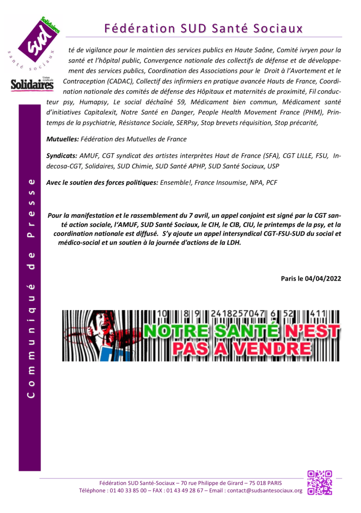 Mise à jour du 4 avril : Préavis de grève SUD Santé Sociaux pour le 6,7,8 avril et…