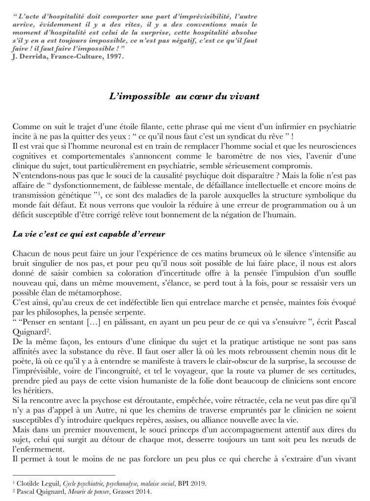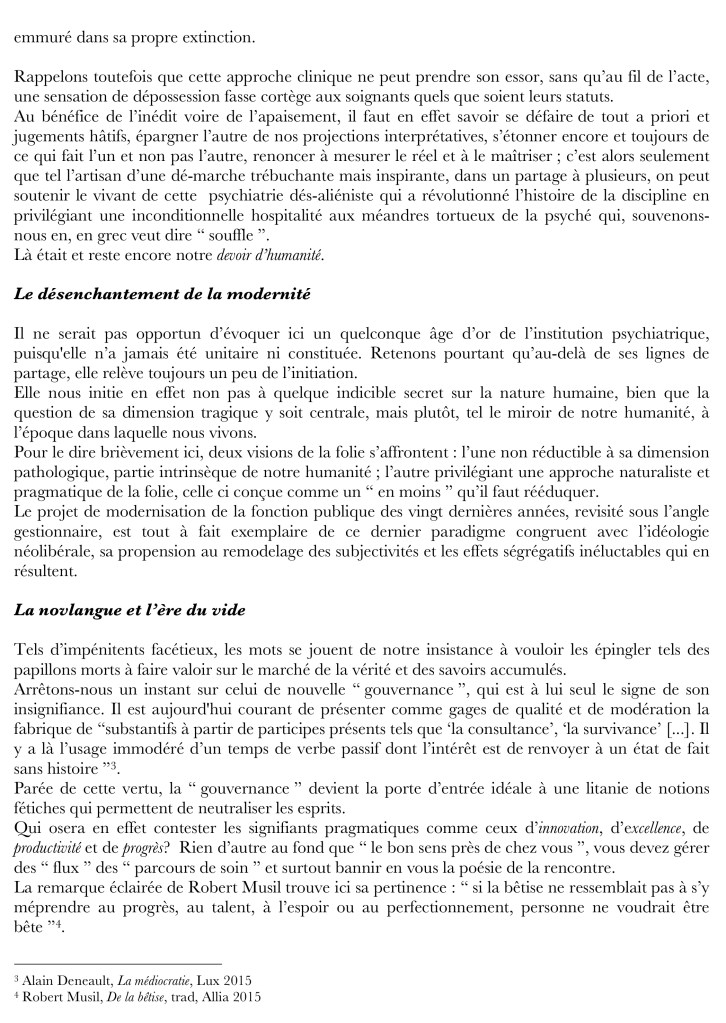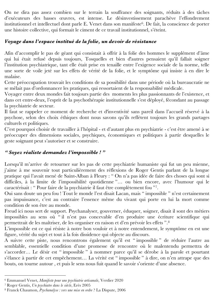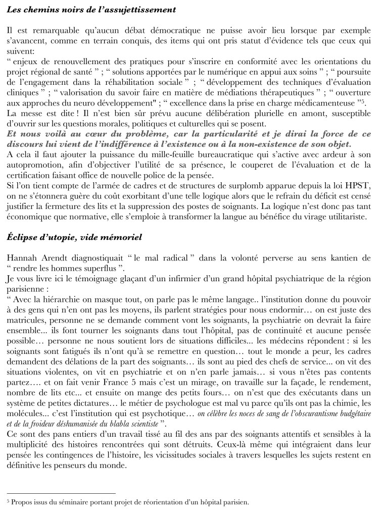 – afin qu’ils soutiennent la ré-humanisation de la psychiatrie et de la pédopsychiatrie, tant sur le plan de conceptions de soins, donc de la formation, que sur le plan des effectifs soignants. C’est aussi une voie indispensable pour réduire les hospitalisations sous contrainte et l’isolement, et pour abolir la pratique injustifiée de contention. Le projet de « basculer » davantage dans la « télé-psychiatrie »[2] est contraire aux besoins du soin psychique, renforce son évitement et appauvrit les pratiques.