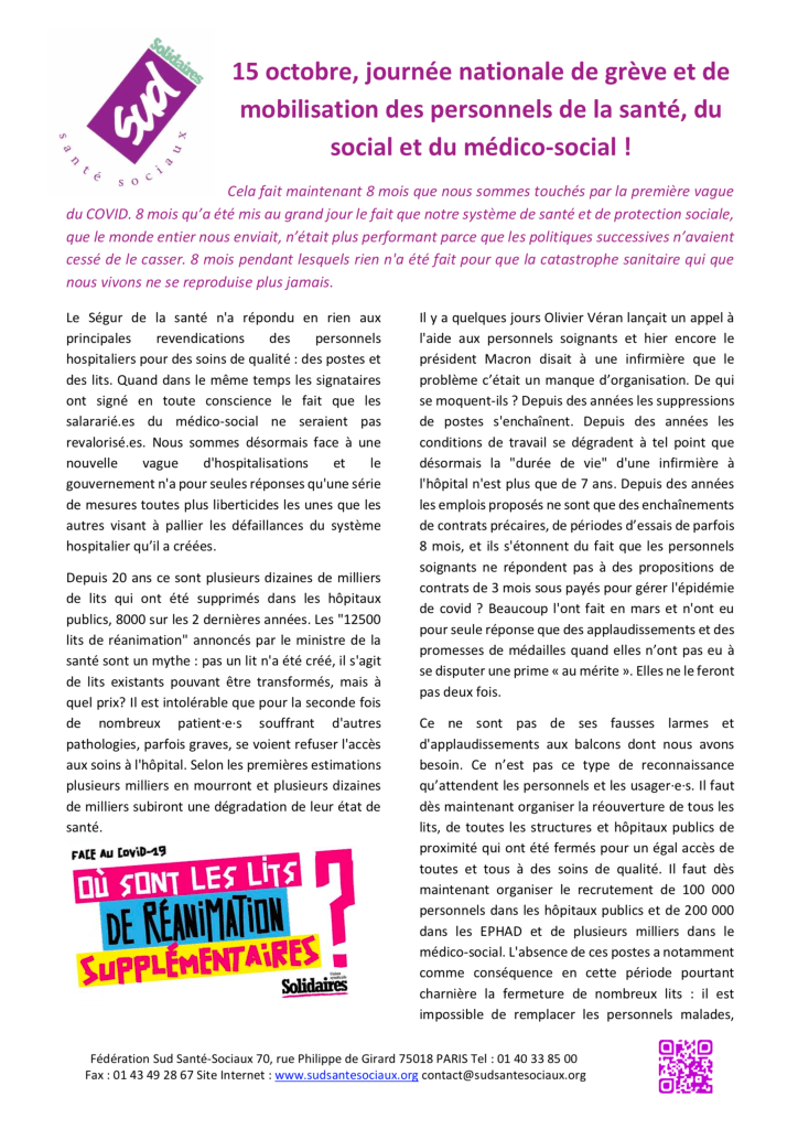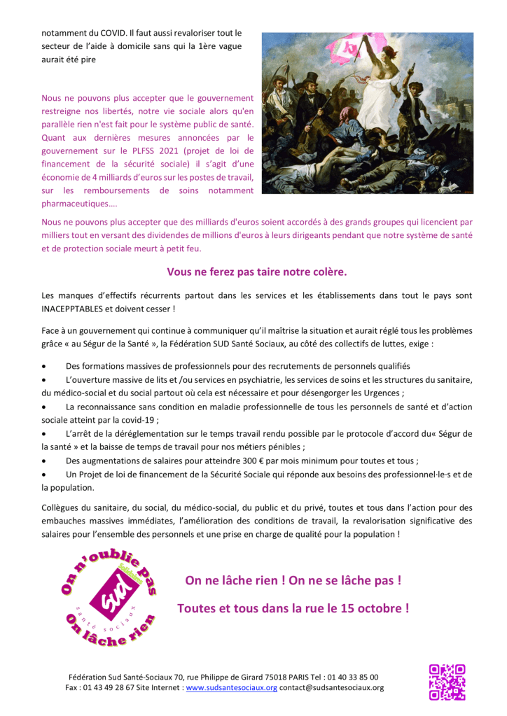 à Paris rassemblement 12h à 13h30 boulevard des Invalides, Métro Varennes pour départ de manifestation à 13h30 en direction de Place Fontenoy à coté du Ministère des Solidarités et de la Santé pour un déploiement et rassemblement statique avec prise de parole sur une camionnette plateau. Dispersion 18h