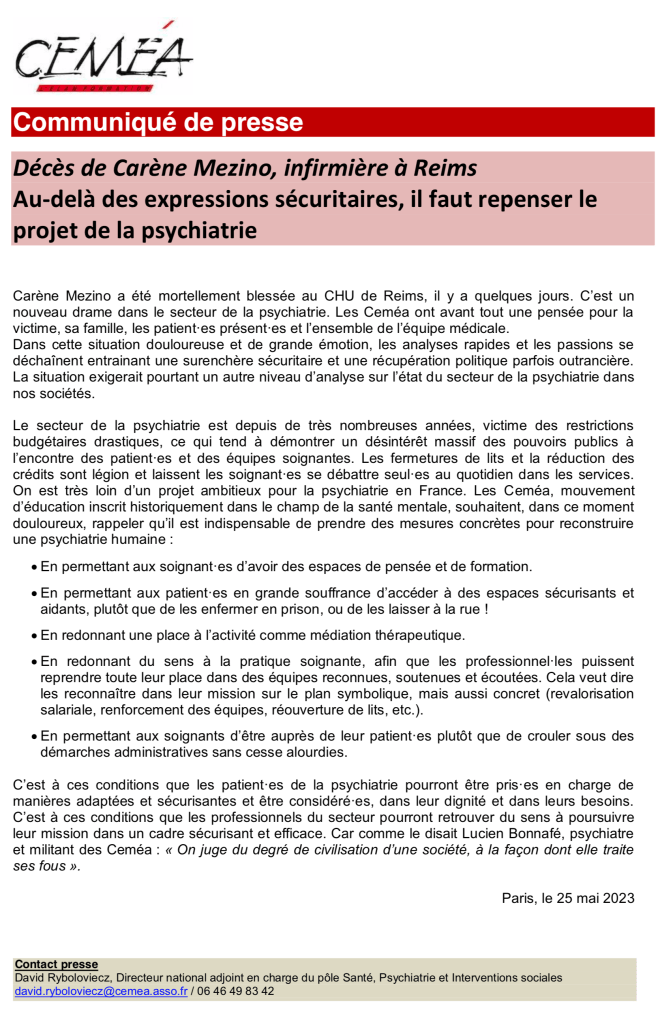 Communiqué de presse des CEMEA du 25 mai 2023 : suite au décès de Carène Mezino, mortellement blessée au CHU de Reims, les Ceméa rappellent l’impérative nécessité de prendre des mesures concrètes pour reconstruire une psychiatrie humaine.