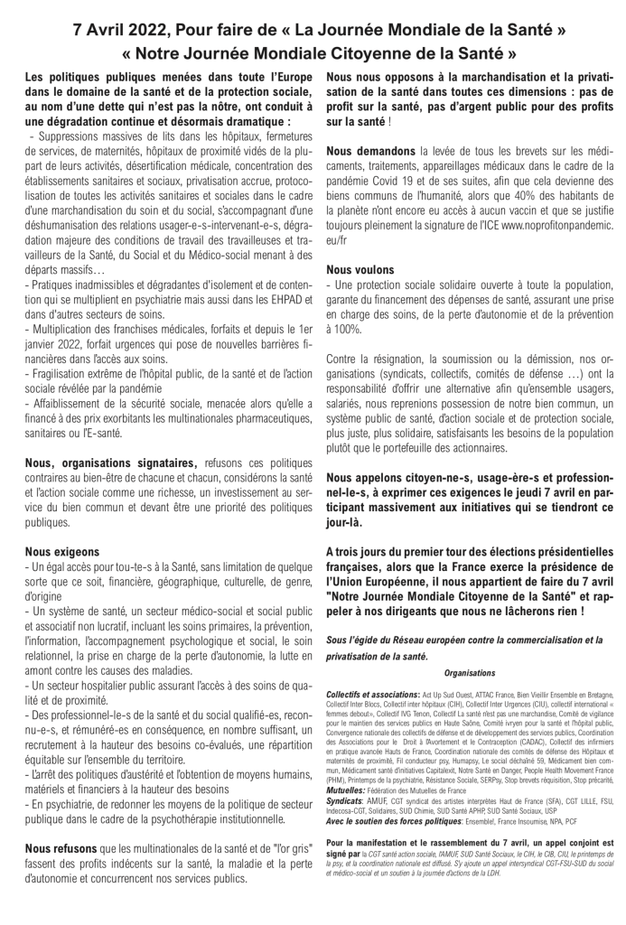 JEUDI 7 : appel signé par le Printemps pour la Journée Mondiale de la Santé. Paris, 14 h 30 départ de la manif de Bastille, vers République, rassemblement festif à 17h.