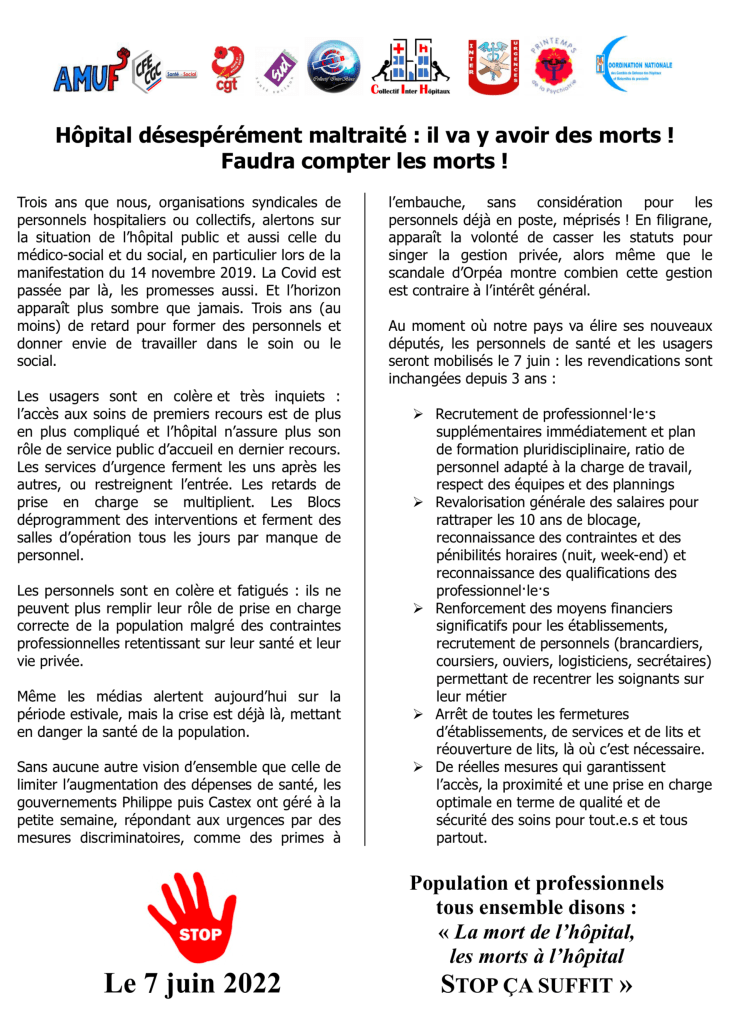 Mardi 7 : Mobilisations contre la mort de l’hôpital. A Paris, rdv devant le Ministère de la santé, prises de paroles entre 13h et 16h30.
