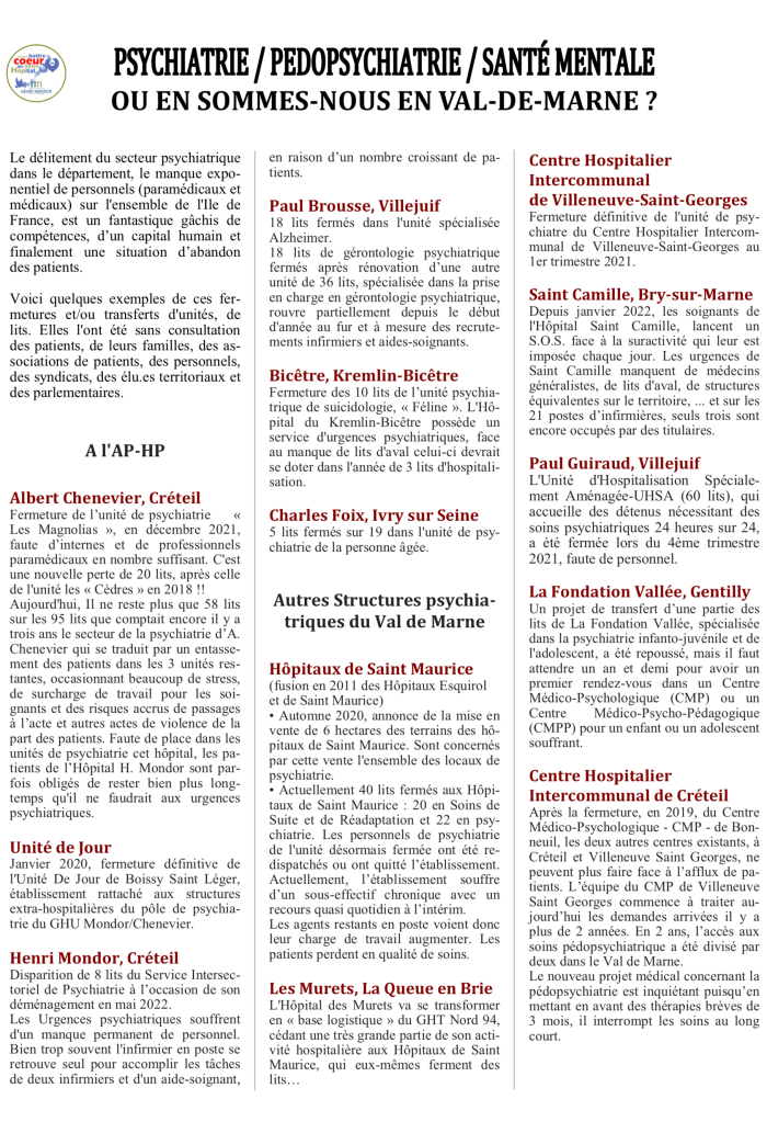 Lundi 30, à 19 h : Débat sur la situation de la psychiatrie en Val de Marne, 12 rue Paul Verlaine, 94410 Saint-Maurice , salle Louis Jouvet.