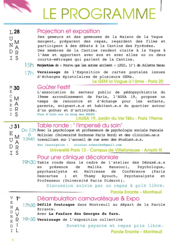 (infos bienvenues printempsdelapsychiatrie@gmail.com l’AGENDA est complété au fur et à mesure)