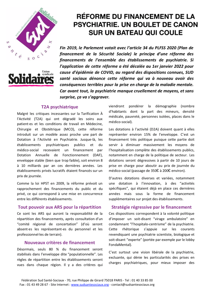 Non à la T2A en psychiatrie Communiqué commun du l’Union Syndicale de la Psychiatrie, de la CGT, de SUD et du collectif Printemps de la psychiatrie, 25/05/2020 : https://www.reformepsychiatrie.org/?p=323