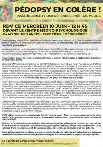 Le Collectif de la Pédopsychiatrie du 19ème en Lutte, appelle à un rassemblement le 10 juin devant leur CMP, et le 16 juin à Paris…