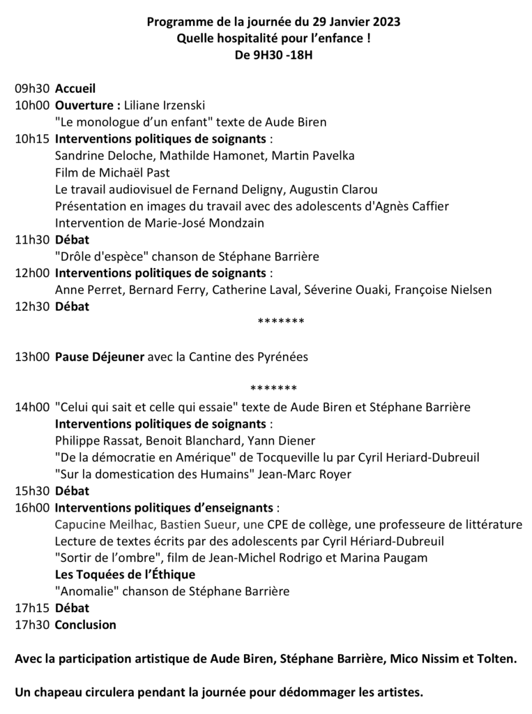 Aussi le 29 janvier, c’est autour d’une parole ouverte portée par des artistes, des professionnels de l’école, du soin, que nous tenterons d’ouvrir d’autres horizons pour retrouver curiosité, inventivité, si nécessaire au devenir de l’enfant.