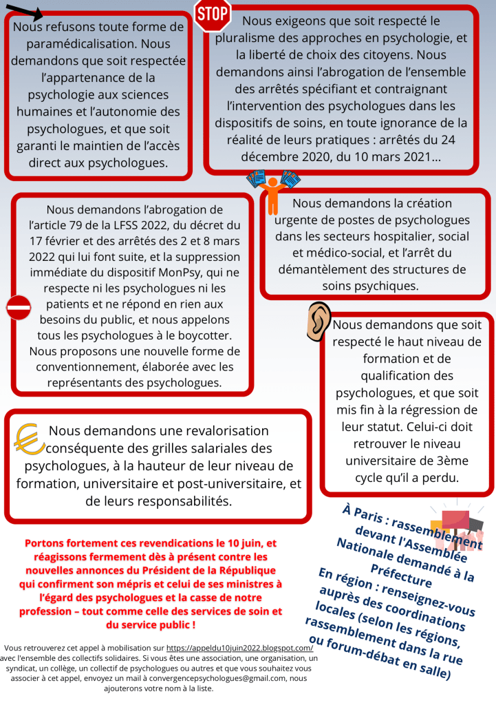 Le vendredi 10 juin 2022 la lutte continue pour la défense du métier de psychologue et l’accès aux soins pour tous. Voici l’appel co-construit par la Convergence des psychologues en lutte, Sud Santé-Sociaux et Sud Collectivités Territoriales. Les lieux et les formes de rassemblement sont consultables sur ce blog : Appel du 10 juin 2022