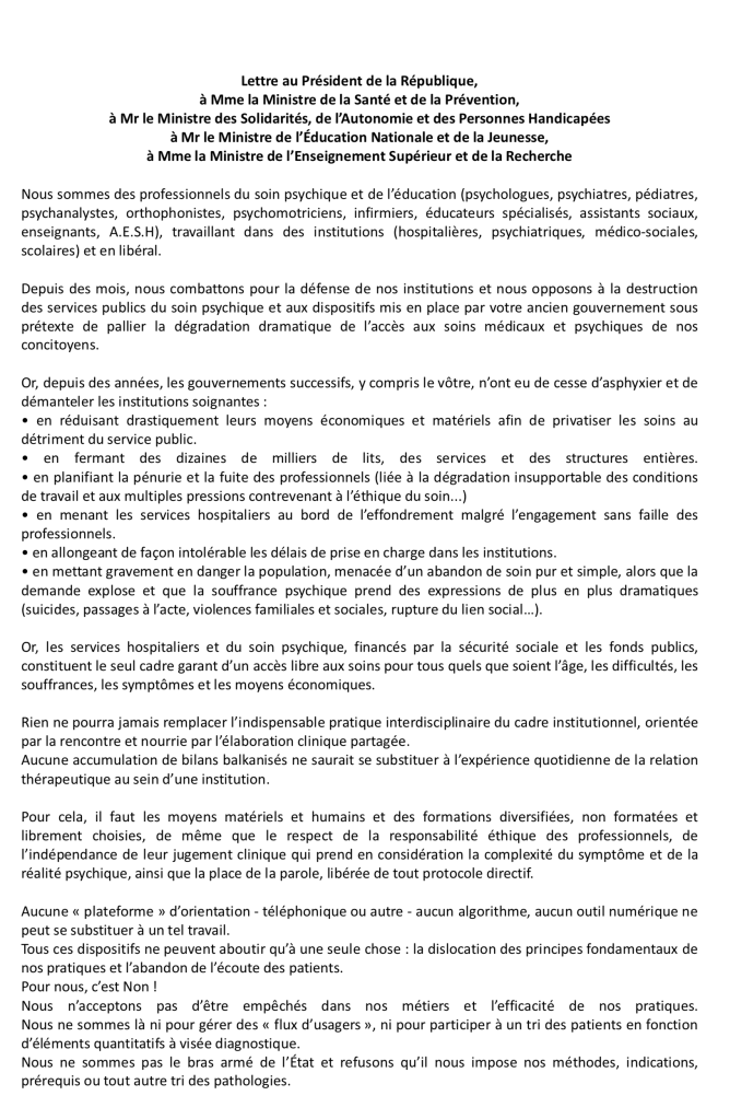 Le Printemps de la Psychiatrie apporte tout son soutien aux psychologues mobilisés pour défendre leur profession jeudi 29 septembre 2022. Dès le début Le Printemps de la Psychiatrie s’est engagé à participer, organiser, soutenir tout débat, toute action ou mouvement cohérent avec son Manifeste, avec tous les professionnels, leurs syndicats, les collectifs, les associations de familles et d’usagers, et l’ensemble des citoyens qui souhaiteraient soutenir et développer une psychiatrie et des soins psychiques émancipateurs du sujet. La Convergence des psychologues en lutte, réunissant près de 40 associations, collectifs ou collèges professionnels, et une intersyndicale large portent des revendications communes. Celles-ci se construisent depuis le 10 mars 2021 quand est paru l’arrêté relatif à la définition de l’expertise spécifique des psychologues exerçant auprès des Plateformes de coordination et orientation, qui réduisent leur intervention aux seules pratiques cognitivo-comportementales. Il est nuisible et non éthique d’annuler le libre choix de l’approche clinique. L’attaque de cette profession est un des signes majeurs de la précarisation légitimée du soin psychique dans la cité. Elle acte la mise au rancart de l’accueil inconditionnel. Un fait insupportable.
