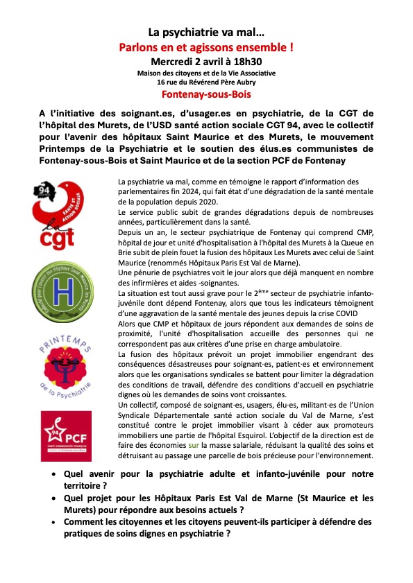Le 2 avril à Fontenay-sous-Bois et le 9 avril à Paris dans le 12ème, le Collectif pour l’avenir des hôpitaux saint Maurice et les Murets organise 2 soirées publiques pour parler de psychiatrie et notamment de la lutte contre la cession aux promoteurs immobiliers d’une partie de l’hôpital Esquirol.
