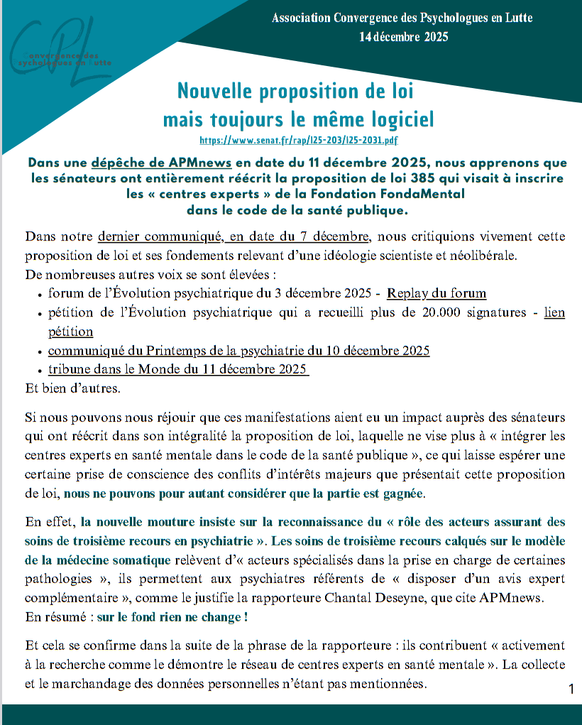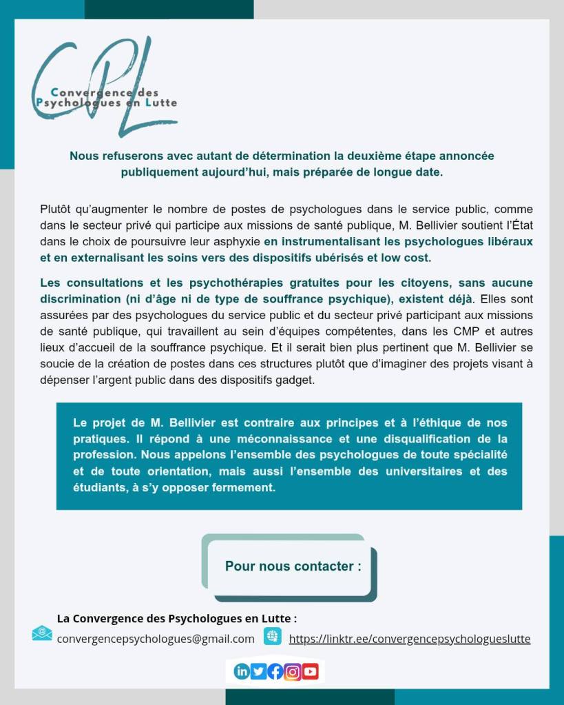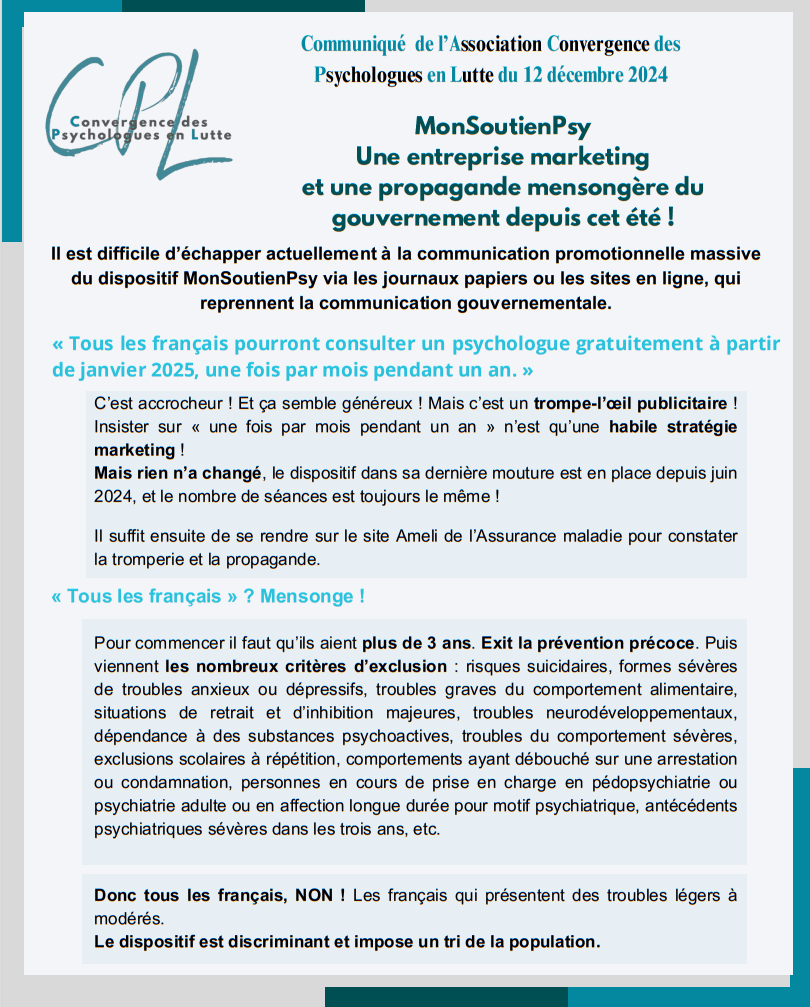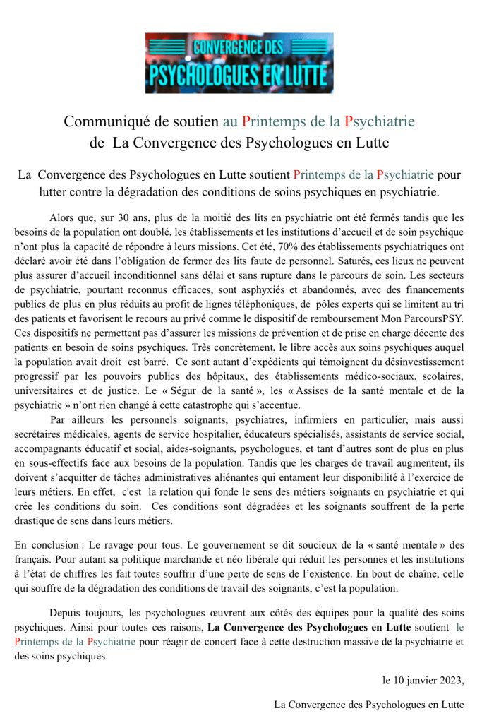 Communiqué commun, Convergence des Psychologues en Lutte, Manifeste psy et le Syndicat National des Psychologues.