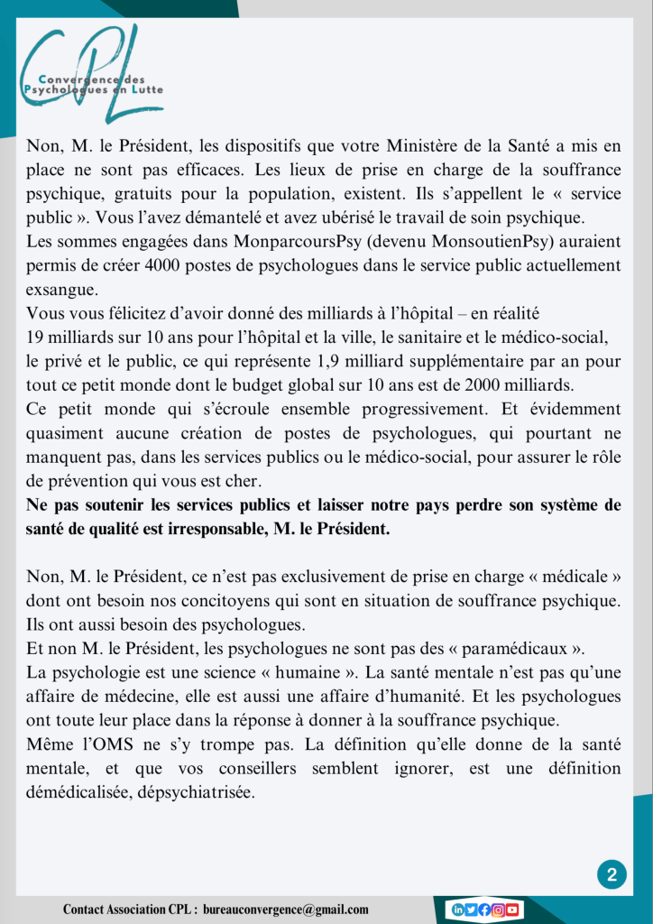 Convergence des Psychologues en Lutte, lettre ouverte au Président de la République