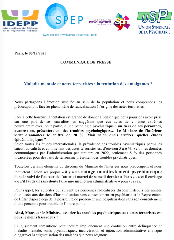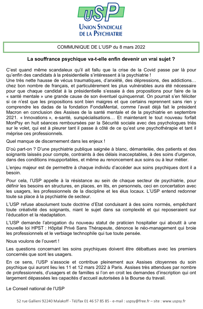 Communiqué de l’USP du 27 septembre 2022 : Soins psychiques en voie d’exécution