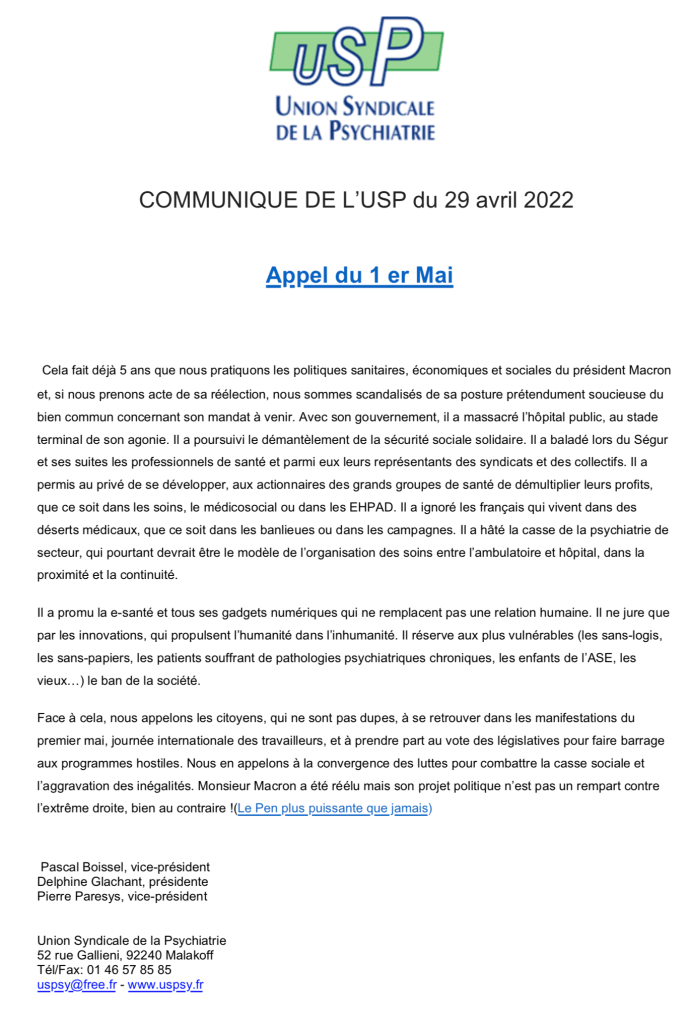 Outre la défense d’un niveau de vie digne pour tous et contre le gouvernement accentuant la précarité de beaucoup, l’USP se mobilise auprès des psychologues le 29 septembre 2022. Car les psychologues, comme les psychiatres, témoignent et interrogent ce qu’il y a d’humain en chacun de nous. Les bâillonner voire les éliminer revient à considérer l’individu comme une machine à produire, efficace, rentable, au garde à vous et rien de plus.