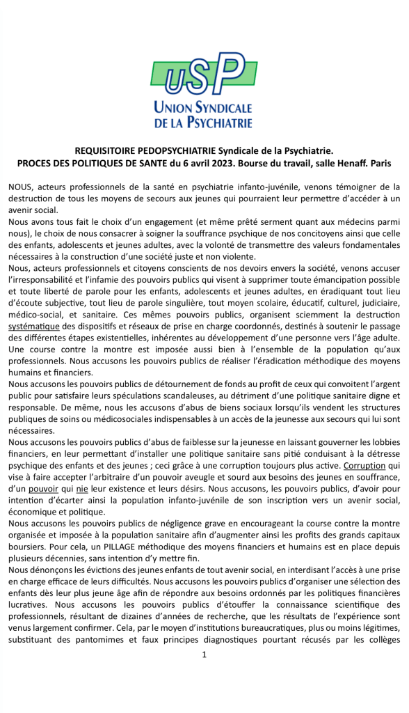 Le 6 avril 2023, faisant suite à la tribune du collectif Notre santé en danger « Nous vous accusons » signée par le Printemps de la psychiatrie, s’est tenu le Procès des politiques de santé.