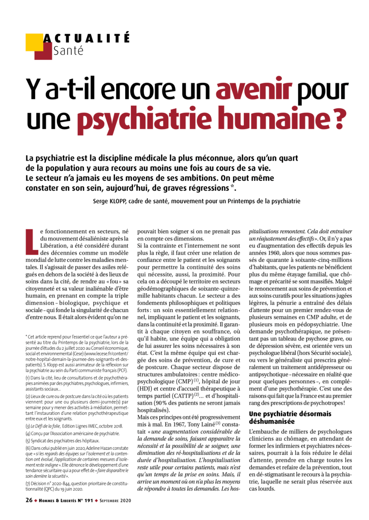 Ce texte a été en grand partie écrit dans l’ambiance porteuse des Assises citoyennes du soin psychique qui se sont tenues à la Bourse du travail à Paris, les 11 et 12 mars 2022, à l’initiative du Printemps de la psychiatrie, de l’Appel des appels et du Collectif des 39. C’est sous le buste de Jean Jaurès et dans la salle Ambroise Croizat, fondateur de la Sécurité Sociale, que se sont réunies cinq cents personnes motivées pour critiquer, analyser et lutter contre l’état de la psychiatrie publique aujourd’hui, et proposer des solutions pour retrouver une psychiatrie à visage humain. Lire la suite