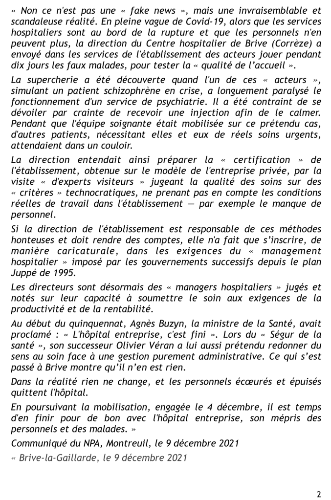 Non ce n’est pas une « fake news », mais une invraisemblable et scandaleuse réalité. En pleine vague de Covid-19, alors que les services hospitaliers sont au bord de la rupture et que les personnels n’en peuvent plus, la direction du Centre hospitalier de Brive (Corrèze) a envoyé dans les services de l’établissement des acteurs jouer pendant dix jours les faux malades, pour tester la « qualité de l’accueil ». (extrait)